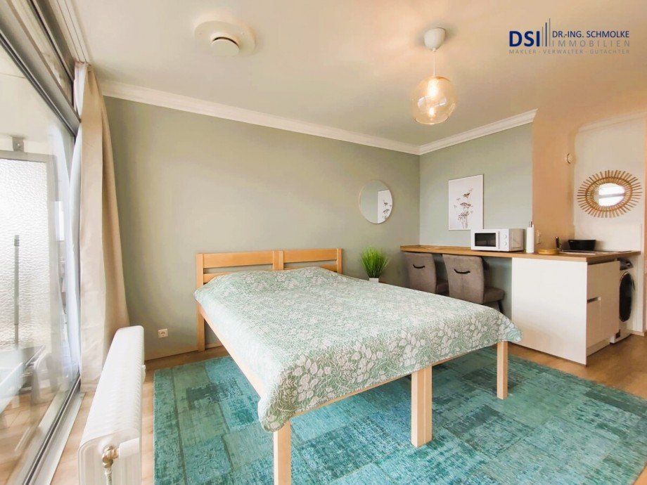 Die Räume betreten Sie durch einen Eingangsflur, auf der rechten Seite liegt das Badezimmer und die Kochnische. Auf der linken Seite befindet sich ein praktischer Einbauschrank. Geradeaus liegt das helle Wohn/Schlafzimmer mit Zugang zum Balkon.